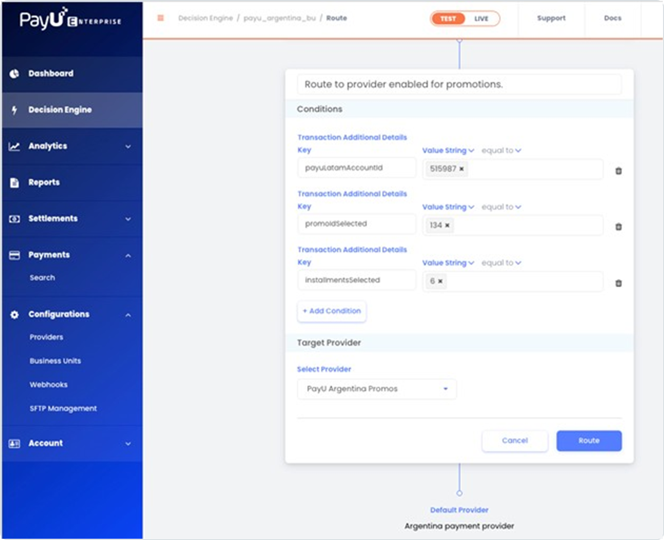 When processing transactions in Argentina, include specific fields in the Charge request to ensure proper routing through PayU’s decision engine. By sending this data, the system can direct the transaction to the correct account, particularly when handling promotions with interest-free installments.